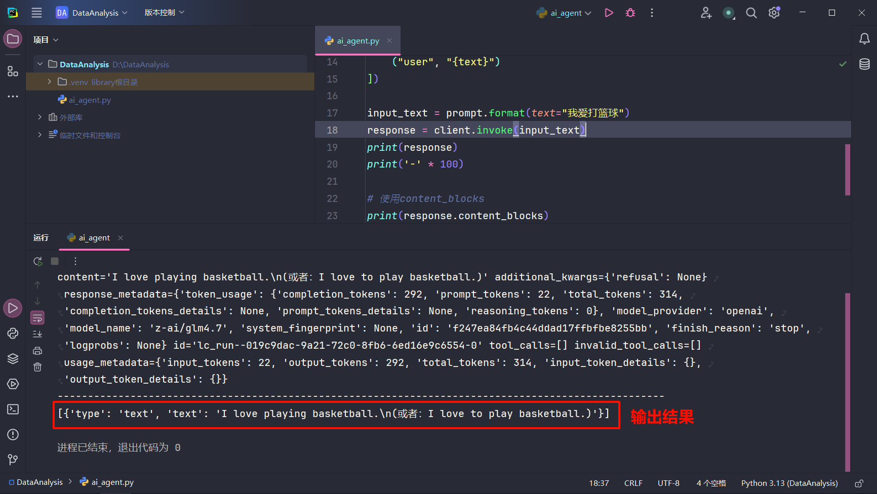 1 2 3 4 5 6 7 8 9 10 11 12 13 14 15 16 17 18 19 20 21 22 import osfrom langchain_core.prompts import ChatPromptTemplatefrom langchain_openai import ChatOpenAIclient = ChatOpenAI( api_key=os.getenv("APIKEY" ), model="z-ai/glm4.7" , base_url="https://integrate.api.nvidia.com/v1" ) prompt = ChatPromptTemplate([ ("system" , "请你将以下内容翻译成英文:" ), ("user" , "{text}" ) ]) input_text = prompt.format (text="我爱打篮球" ) response = client.invoke(input_text) print (response)print ('-' * 100 )print (response.content_blocks)